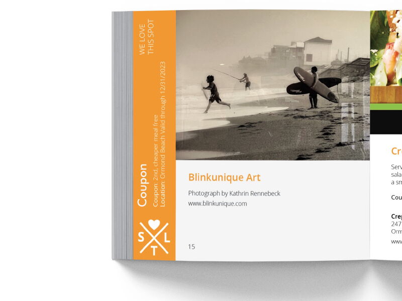 The Love This Spot Voucher book supports local artists by featuring their work within its pages. Each voucher book showcases the talents of local artists through custom-designed pages, illustrations, or artwork interspersed throughout the book.